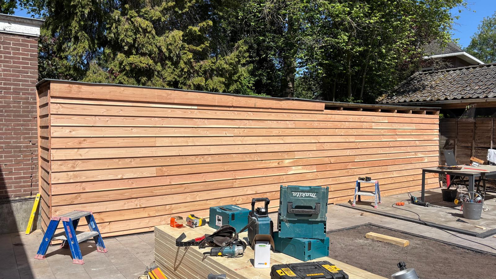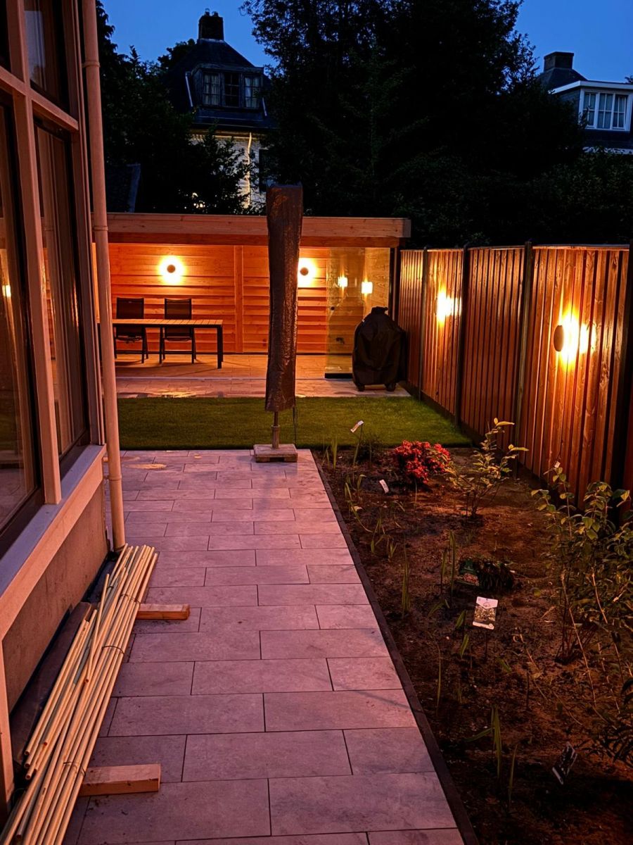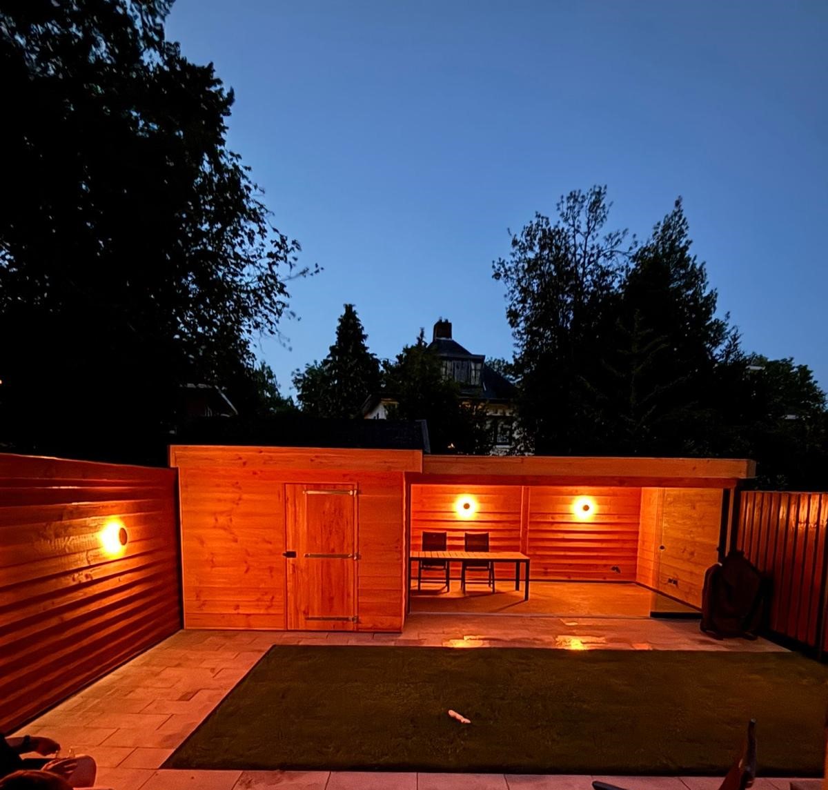 Buiten is de herinrichting van de tuin volledig door ons gefaciliteerd. De achterwand van de schuur van de buren is door ons vervangen. Daarnaast hebben we georganiseerd dat de wildernis die de tuin eerst was is omgetoverd tot een fijne leeftuin met moderne uitstraling. Er is een nieuwe erfafscheiding geplaatst en ook een schuur met overkapping. Strakke bestrating, nieuwe beplanting en het lichtplan geïntegreerd in het tuinontwerp maken het geheel af.